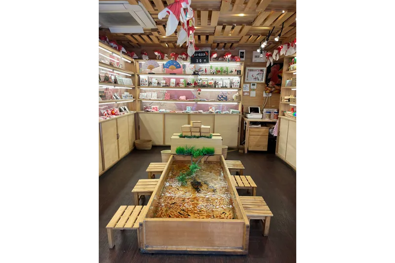 こちらは浅草名物「ジャンボめろんぱん」で知られる「浅草花月堂」が手掛けるお店です。店内は、軒先に飾られた金魚提灯をはじめ、60種類以上の金魚雑貨に囲まれた空間。中央にある金魚たちが泳ぐ国産の総ヒノキ造りの水槽が目を引きます。