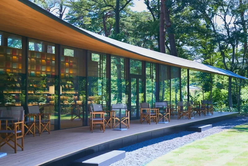 外観は、一面ガラス張りとなっていて、モダンでスタイリッシュな雰囲気。大きな軒を設えたテラス席では、四季の移ろいを感じながら読書時間を過ごせます。