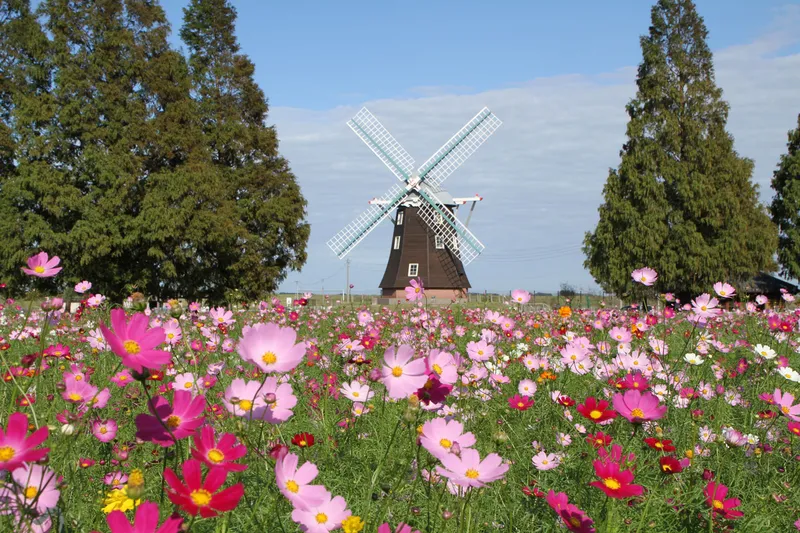 同園で見られるのは、色とりどりのチューリップと花畑に設置された風車が作り出す、異国情緒漂う華やかな景観。例年4月上旬から中旬にかけて見ごろを迎え、「チューリップフェスティバル」も開催されます。