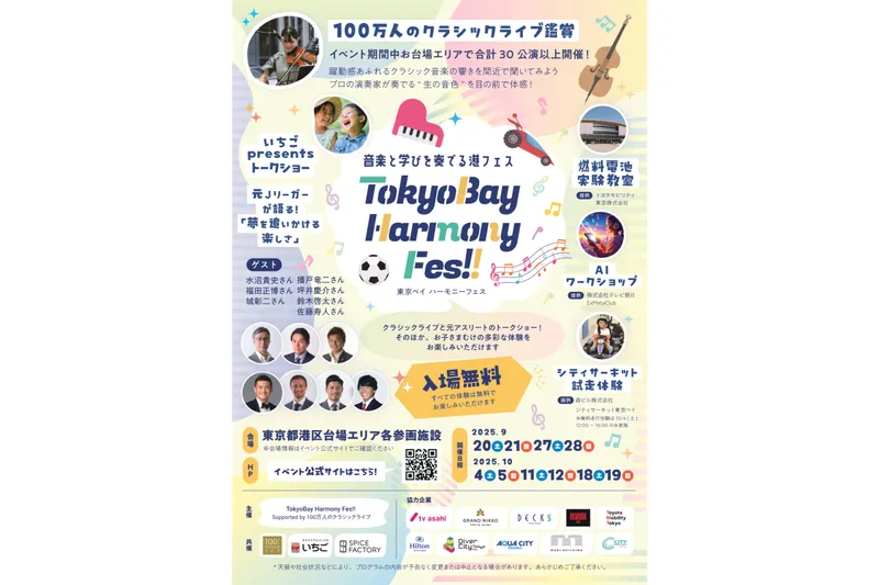 お台場エリアの施設や企業が連携し、音楽・学びを通じて次世代を育む新しい地域イベントが誕生します。 期間中、合計30公演以上のクラシックライブと元プロサッカー選手によるトークショーを開催。そのほか、サイエンス・テクノロジーなど、多彩な体験プログラムを展開します。お台場エリアの複数施設を巡りながら、楽しめます。 「TokyoBay Harmony Fes!!」は、子どもたちが多様な体験から好奇心を広げ、未来への一歩を踏み出すきっかけを提供します。